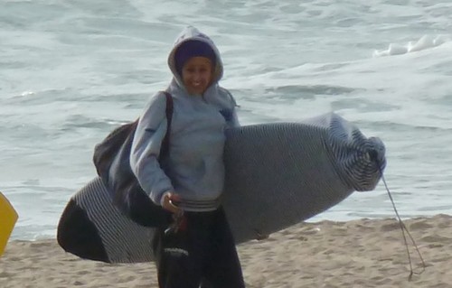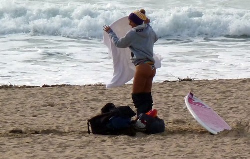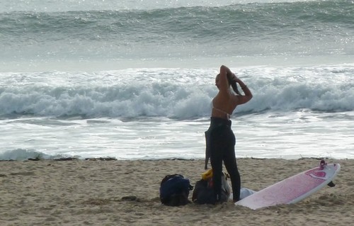 Antes de entrar no mar, a jovem vestiu o fato e fez alguns alongamentos para evitar lesões