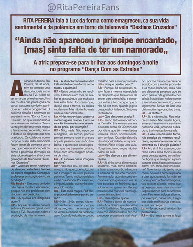 Ao longo do tempo, Rita Pereira, de 31 anos, tem-se tornado uma das principais estrelas da TVI. Além de ser uma das primeiras escolhas em muitas das produções do canal, costuma também participar em vários programas. O próximo desafio é o formato de entretenimento “Dança com as Estrelas”, no qual vai mostrar os seus dotes de bailarina. Tem a vantagem de estar mais magra e fisicamente preparada, devido à dieta e ao desporto que tem praticado. Os cuidados com o corpo e o seu lado emocional foram temas da conversa com a Lux, que passou ainda pela recente e polémica afirmação da actriz sobre alegados atrasos nas gravações da telenovela “Destinos Cruzados”.